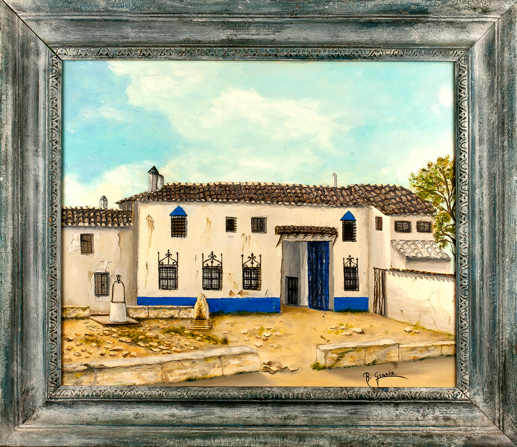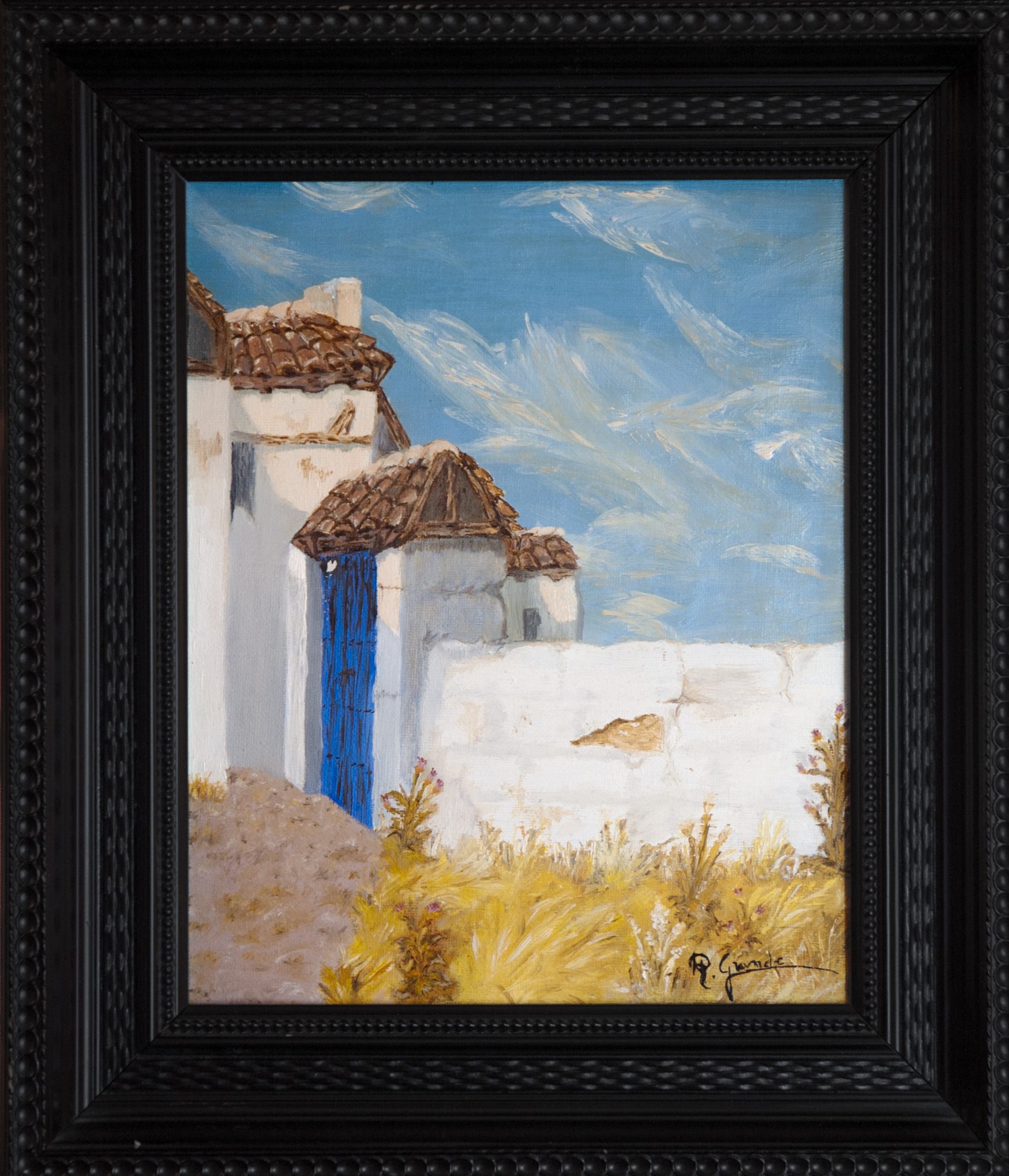 En esta pintura, Rafaela Grande Díaz nos sitúa frente a una vivienda típica de la Mancha rural, posiblemente una casa de labor o una antigua finca ya despoblada. La puerta azul, vibrante e inesperada en medio de la sobriedad del entorno, se convierte en el punto focal de una escena que respira silencio, nostalgia y calor estival.