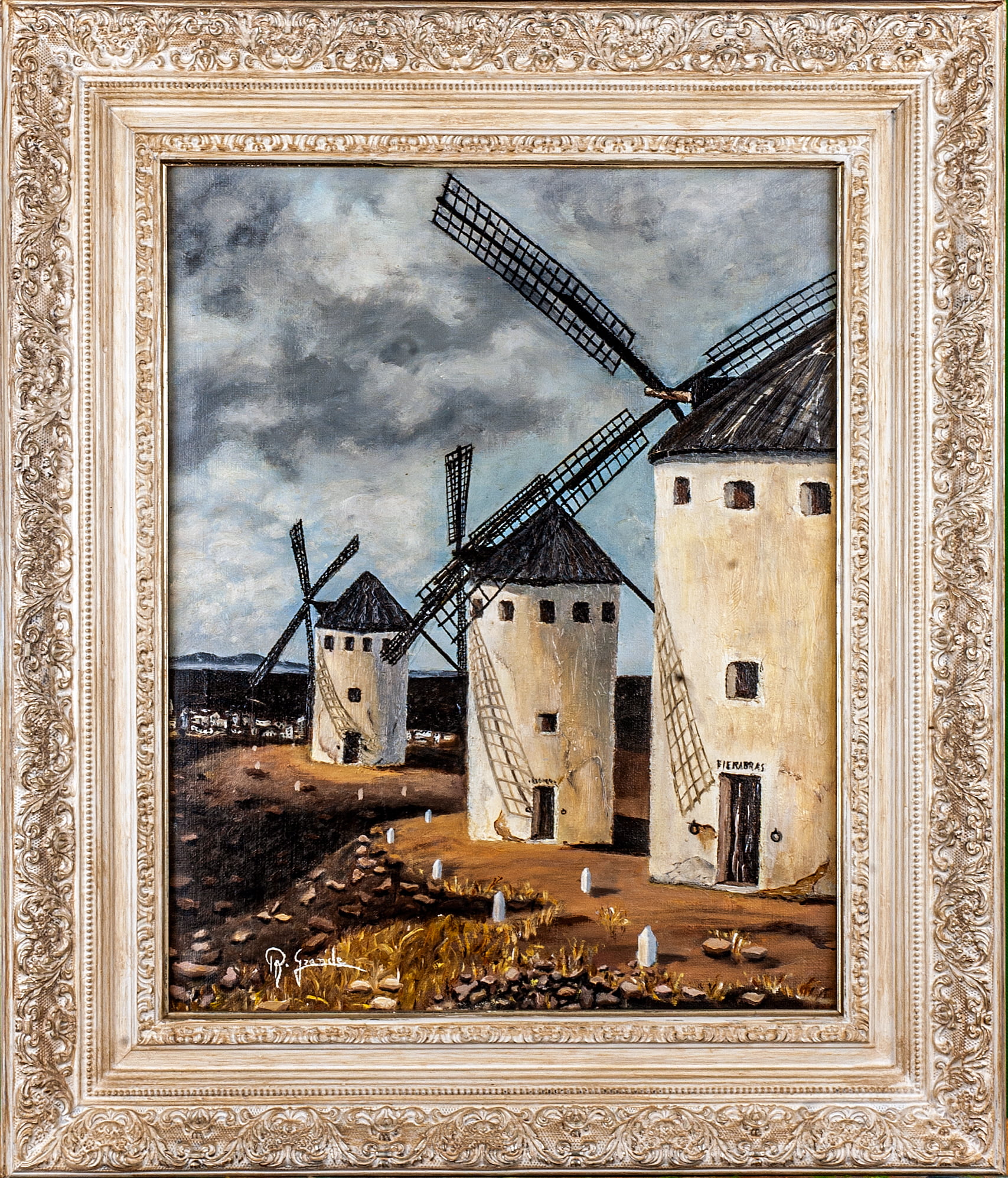 Este óleo firmado por Rafaela Grande representa una de las imágenes más emblemáticas de Castilla-La Mancha: los molinos de viento sobre una llanura dorada, bajo un cielo dramáticamente encapotado.