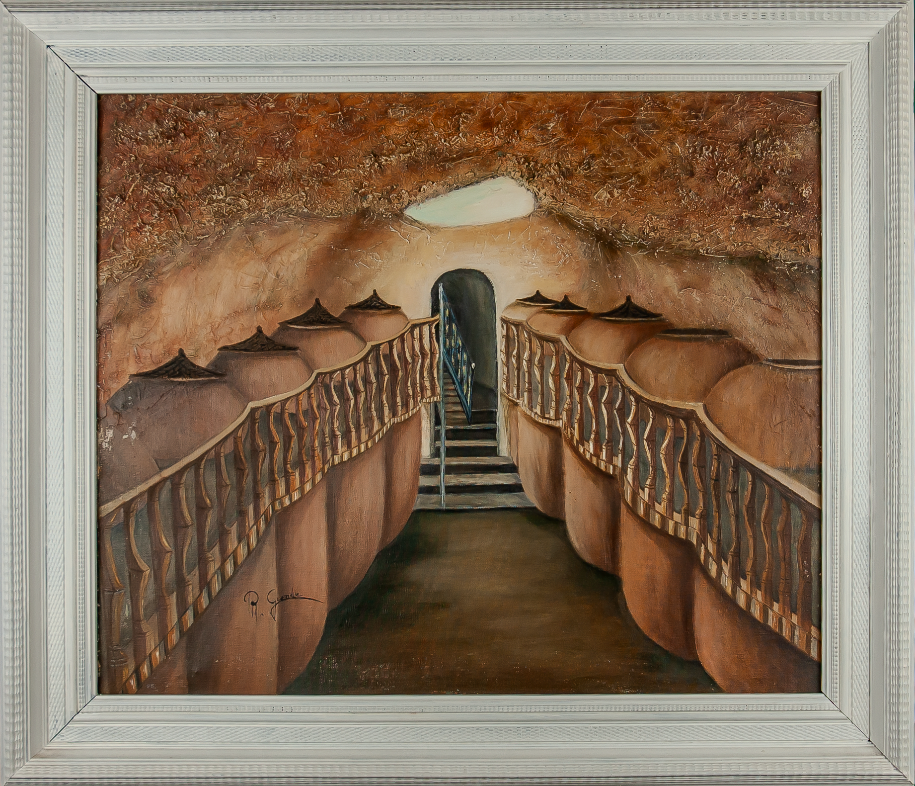 La obra muestra el interior de una bodega subterránea tradicional, con grandes tinajas de barro alineadas a ambos lados de un pasillo central. La luz que entra por una abertura en el techo crea un juego de claroscuros que añade profundidad y una atmósfera de recogimiento. Este tipo de arquitectura es característico de las cuevas-bodega de Tomelloso, excavadas a mano en la tosca roca para la elaboración y conservación del vino