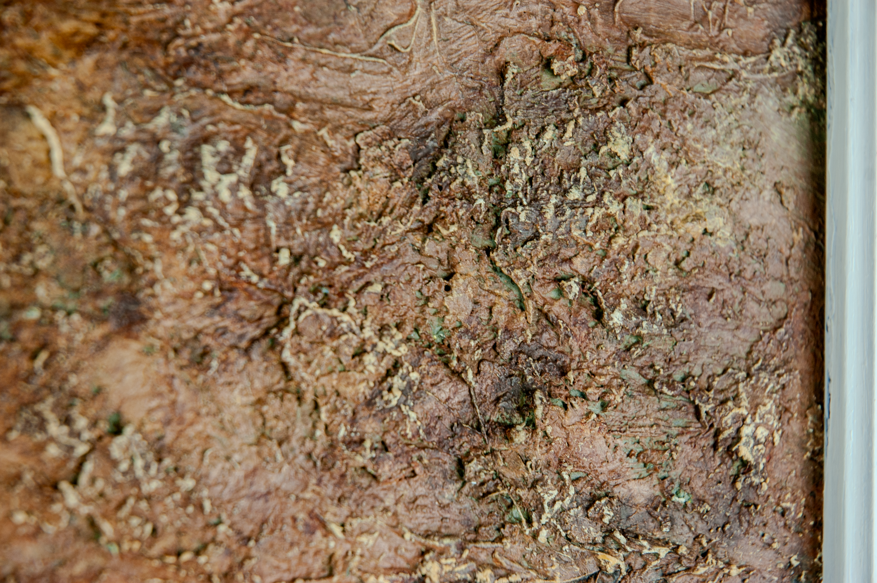 El uso de texturas en las paredes y el techo sugiere un trabajo minucioso con espátula o pincel seco para reforzar la sensación de cueva natural o excavada. La presencia de la barandilla curva y la escalera al fondo crea una composición en perspectiva muy efectiva, que guía la mirada hacia la luz: una salida, una promesa, una continuidad.
