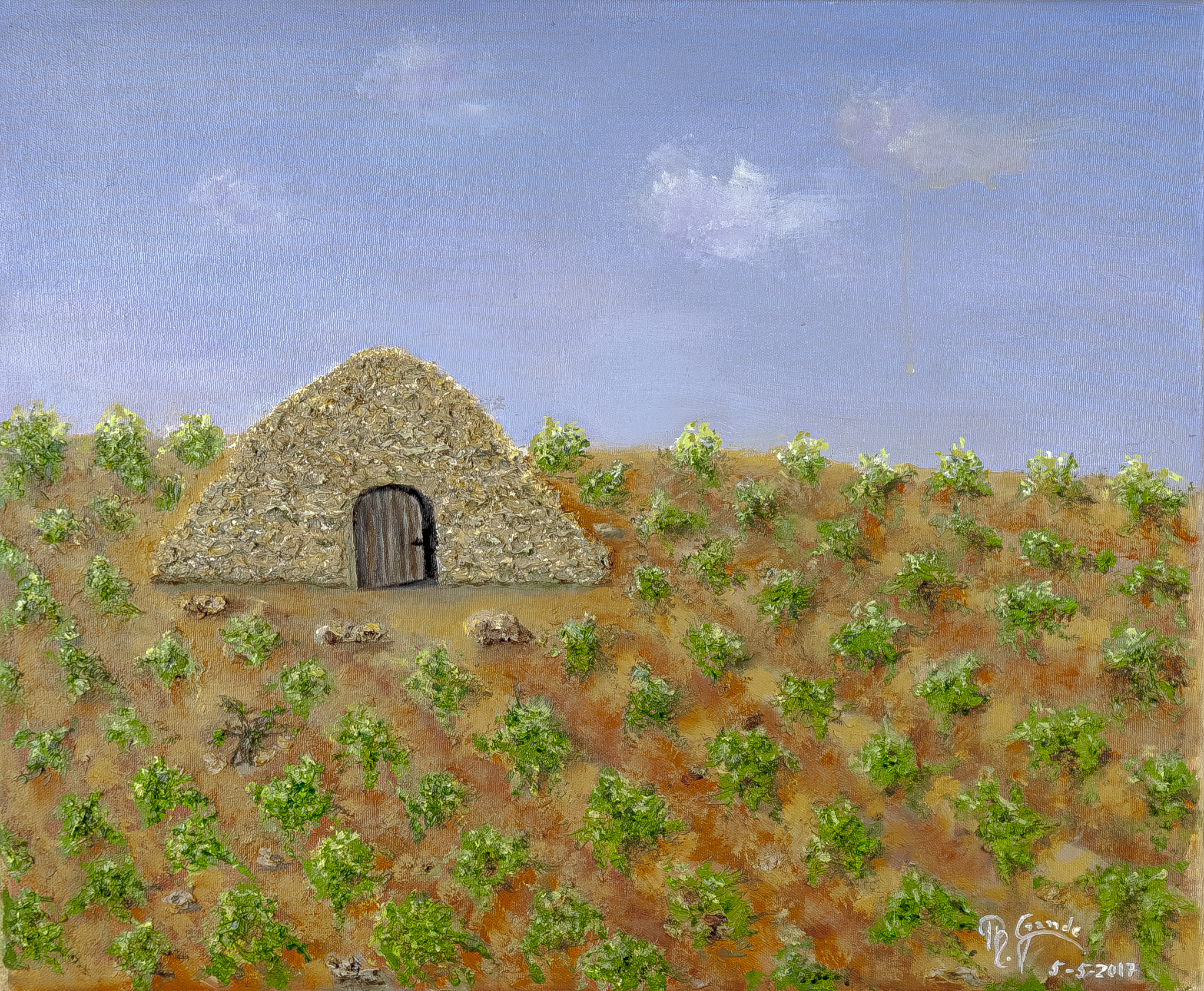 En esta obra, Rafaela Grande Díaz nos transporta al corazón de La Mancha, concretamente a los viñedos de Tomelloso, donde la tierra y el esfuerzo humano han dialogado durante siglos. El protagonista de la escena no es solo la viña, que se extiende viva y ordenada sobre el terreno, sino también el bombo de piedra, silencioso testigo del trabajo agrícola y símbolo inconfundible de la cultura manchega.