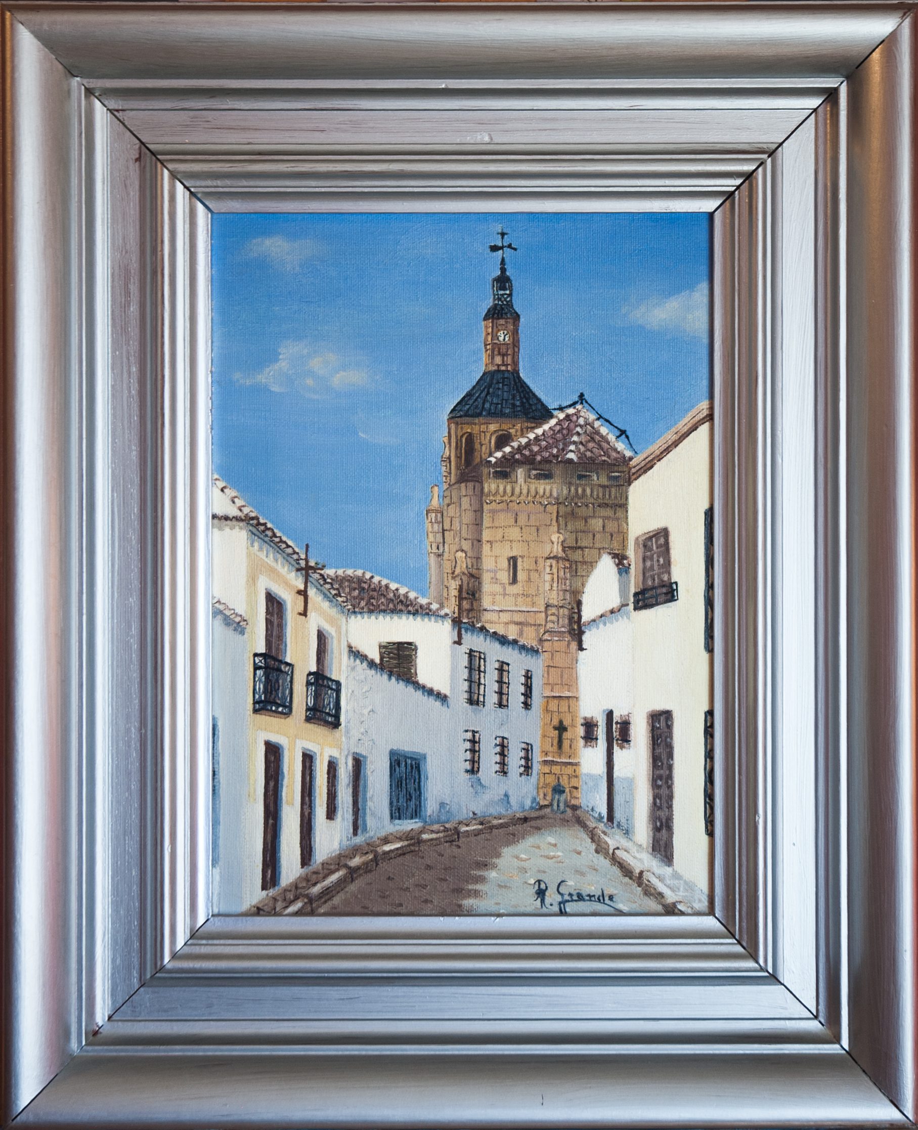 Esta obra de Rafaela Grande Díaz nos sumerge en el corazón arquitectónico de La Mancha: los patios porticados de Almagro. Con pinceladas cuidadosas y una paleta cálida, la autora retrata un rincón lleno de historia, donde se respira el legado del Siglo de Oro y la arquitectura civil manchega.