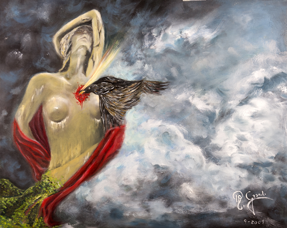 La figura femenina desnuda, expuesta y abierta al dolor, es atacada directamente en el corazón por un ave negra, símbolo tradicional de sufrimiento, pérdida o traición. El uso de nubes y cielos turbulentos refuerza la sensación de vacío, desorientación y duelo emocional.
