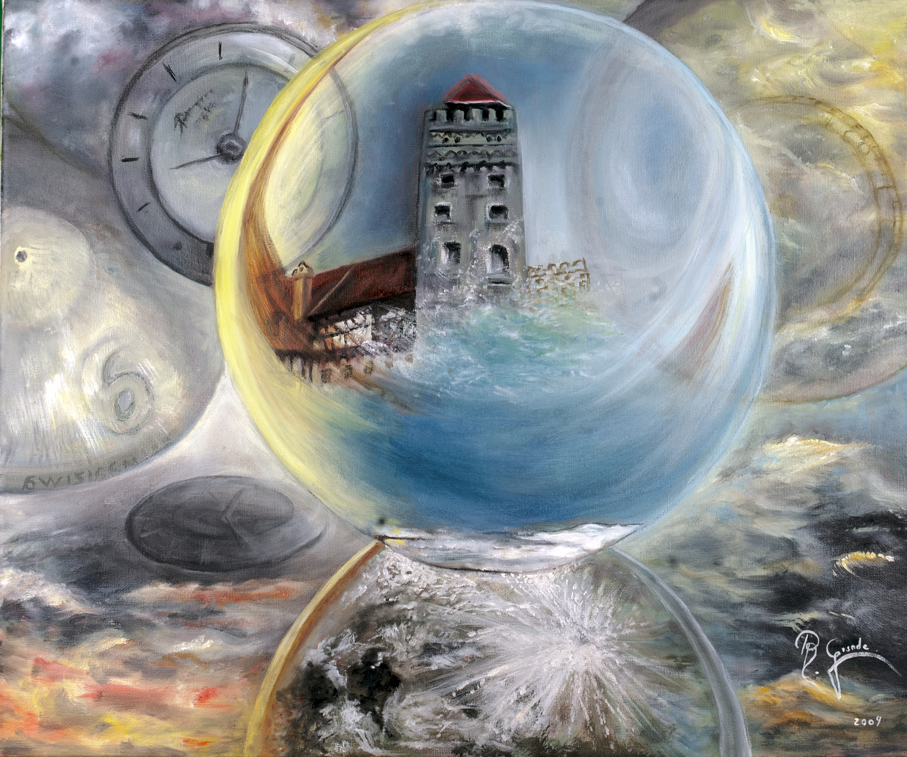 Es un sueño atrapado en cristal, un mundo que flota, frágil pero eterno, mientras el cielo, entre tormentas, susurra la promesa de que nada muere del todo, solo se transforma.