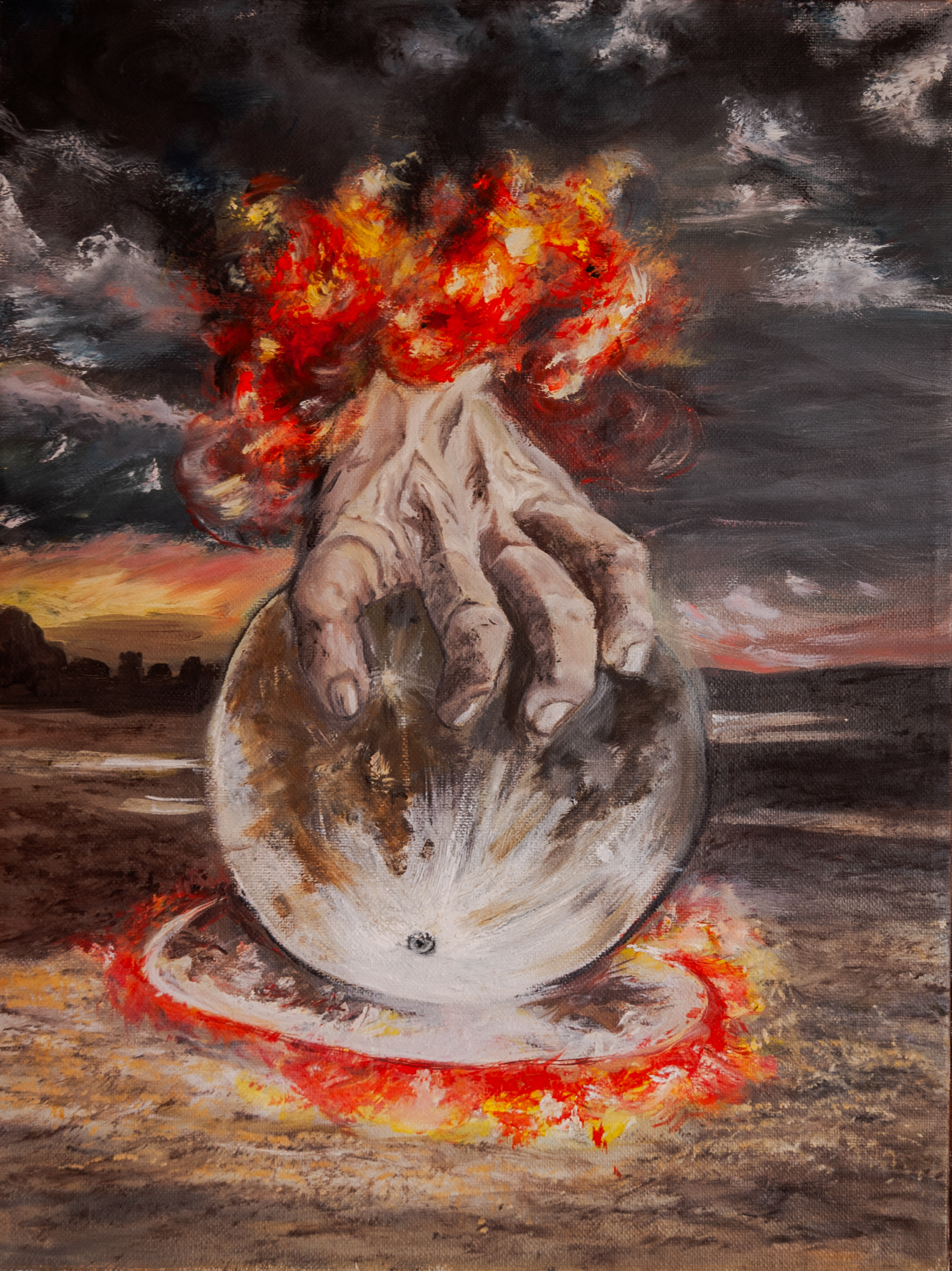 Una mano colosal emerge del fuego, aplastando un mundo frágil en un paisaje herido. Con un estilo surrealista y expresionista, el cuadro retrata la violencia del cambio, la ruptura del equilibrio y la fuerza incontrolable de lo inevitable.