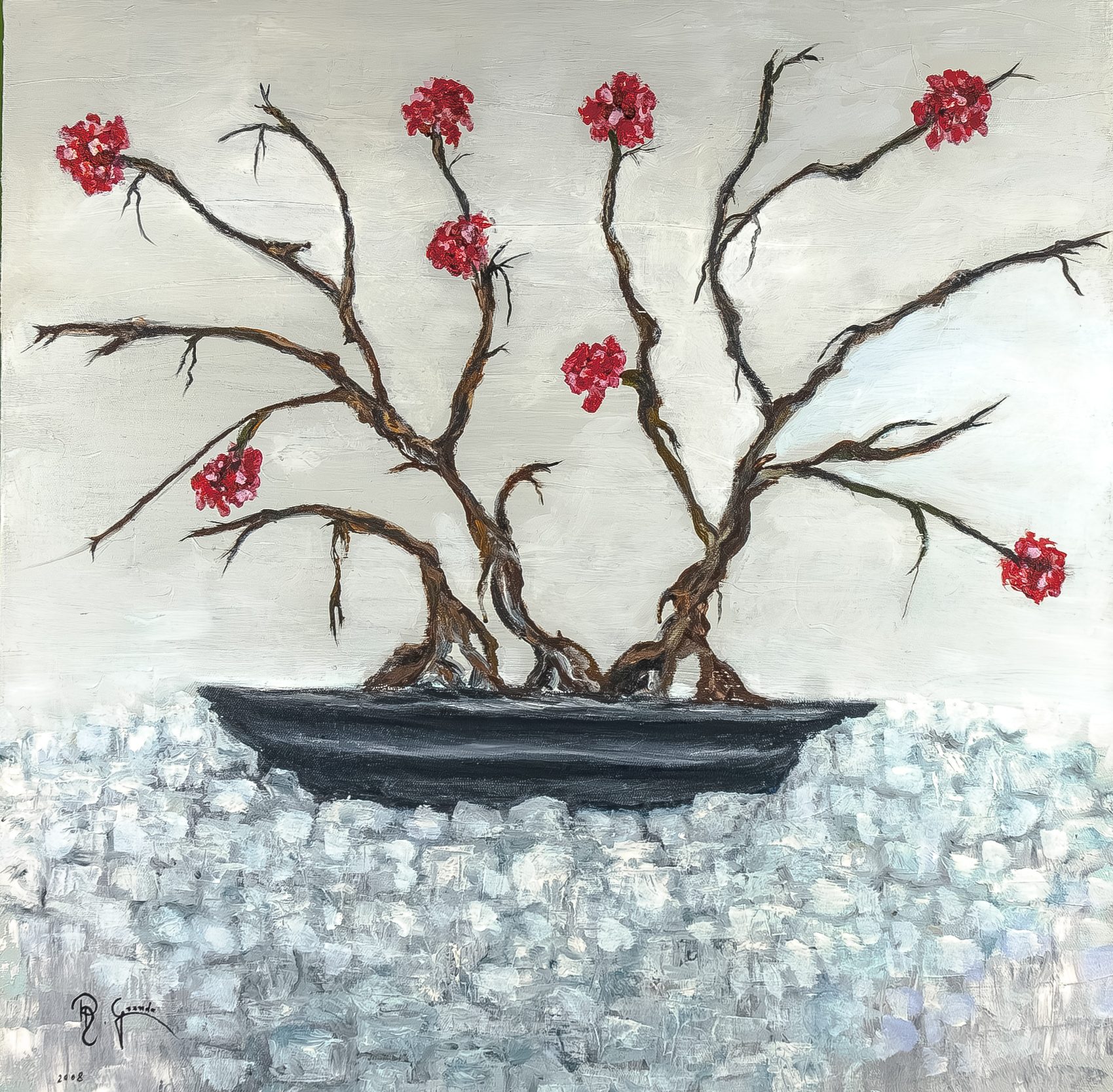 Esta pintura nos sitúa frente a una composición simbólica cargada de fuerza poética. Sobre un fondo grisáceo y neutro, una maceta alargada y oscura sostiene un conjunto de ramas desnudas y retorcidas, de las que brotan racimos florales rojos. Todo el conjunto descansa sobre lo que parece ser una base de hielo, cristal o piedras gélidas, pintadas con una textura gruesa y pinceladas blancas y azules que evocan frío, pureza o aislamiento.