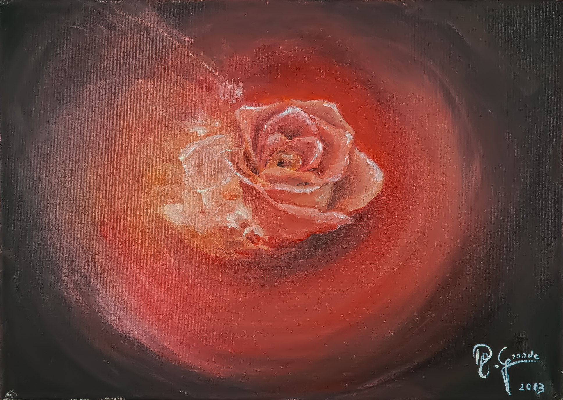 Este cuadro marca un giro en la obra de Rafaela Grande Díaz, donde se aleja del paisaje rural o urbano y se adentra en el simbolismo floral con una fuerza emocional y estética que impresiona por su intensidad. El lienzo, fechado en 2023, nos muestra una rosa solitaria, suspendida en un fondo oscuro que se va encendiendo en círculos concéntricos, como si el color emanara desde el corazón de la flor.