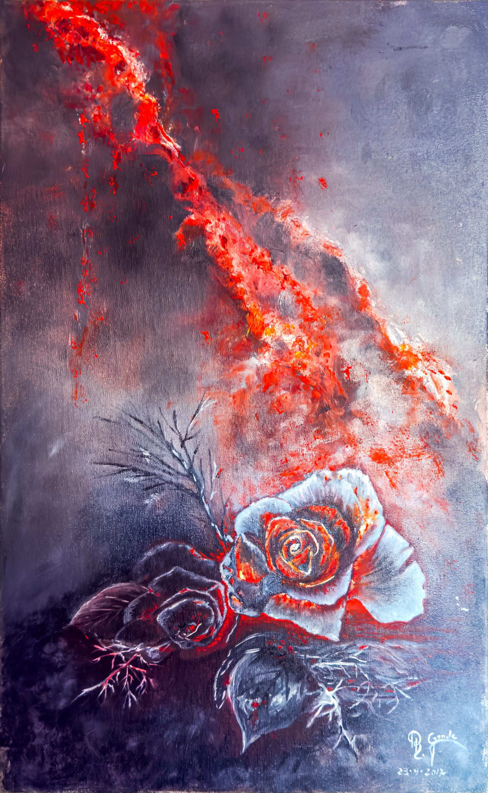 En esta pintura de Rafaela Grande irradia una potencia emocional intensa y contenida. En la parte inferior del lienzo, emergen rosas de tonos fríos, trabajadas en gamas de blanco, gris y púrpura, cuyas formas parecen estar congeladas… o heridas. Sin embargo, desde el corazón de estas flores —y ascendiendo en diagonal hacia el extremo superior izquierdo— irrumpe una llamarada roja, como una explosión interna que rompe el silencio del fondo oscuro y desolado.